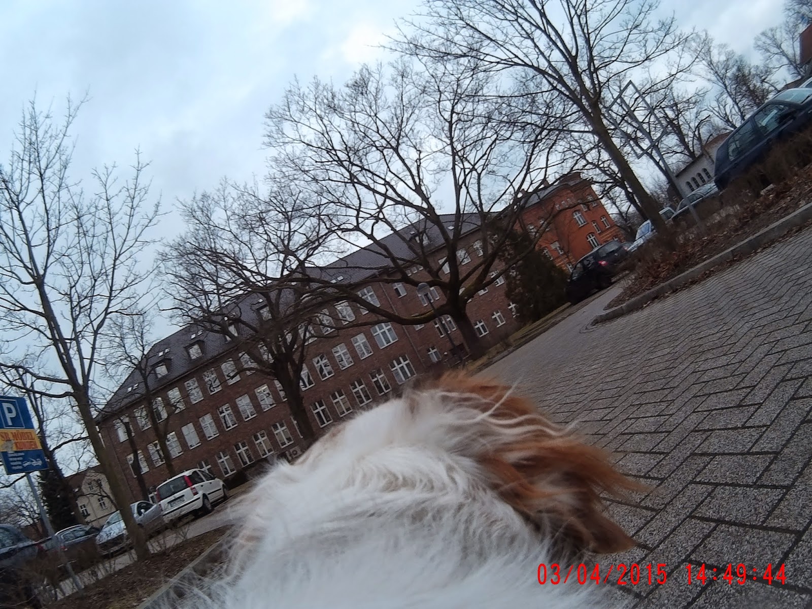 Da dieses Geschirr ja verstellbar ist, habe ich es dann mal auf Joeys Größe eingestellt. Auch wenn Joey Katastrophulus nicht so gut am Geschirr läuft, aber wir haben dann bei der Tour zum REIZ die erste Proberunde gemacht (und wie das eben so ist, erst unterwegs festgestellt, dass die Speicherkarte zu Hause noch im Rechner steckt und nicht in der SJ4000).